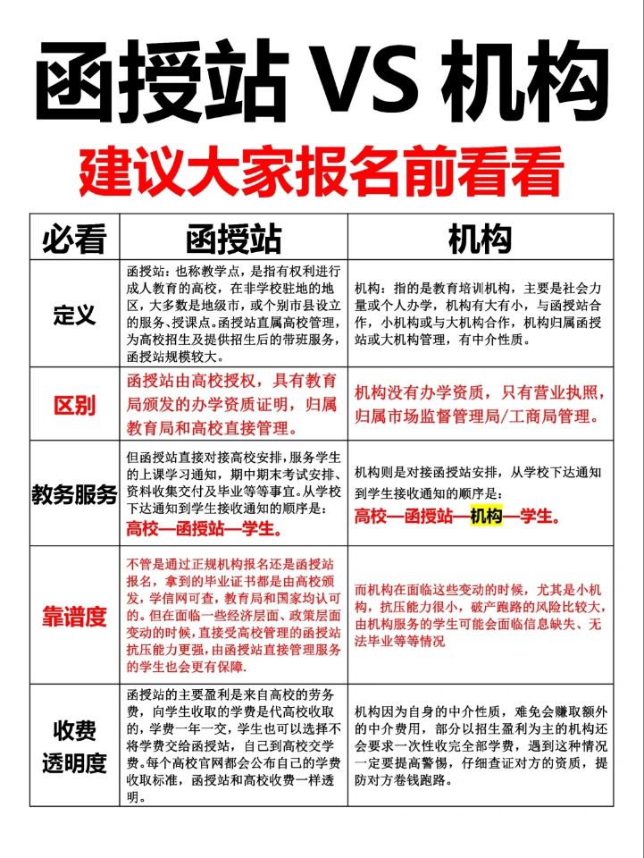报名成人高考,机构和函授站有什么区别?很多同学都分不清楚函授站跟机构到底有什么区别?报名是找机构靠谱呢,还是找函授站靠谱呢?今天就函授站和机构的区别、优缺点做了一张图,一目了然,建议有想要报考成人高考的考生认真看一下这张图,就能明白是选择函授站报名还是机构报名了!