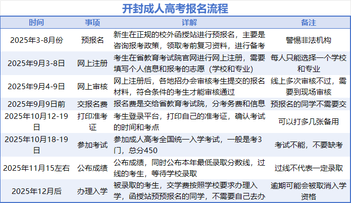开封市,简称“汴”,古称大梁、启封、汴州、汴梁、汴京、东京,是河南省辖地级市、大城市 [145],河南省原省会,国务院批复确定的中国中原城市群核心区的中心城市之一、海内外知名旅游城市、河南省文旅龙头城市之一,是郑州都市圈主引擎组成部分、重要的科创智造基地,总面积6239平方公里。截至2023年6月,开封市辖5个区、4个县。在开封市学历是非常重要的,而很多人提升学历都是选择成人高考的形式。成人高考全称是成人高等学校招生全国统一考试,是为中国各类成人高等学校选拔合格的毕业生以进入更高层次学历教育的入学考试,成人高考属国民教育系列,列入国家招生计划,国家承认学历,全国招生统一考试。成人高等学历教育分为专科起点本科(简称专升本)、高中起点本科(简称高起本)和专科(简称高起专)三种;在校学习形式分脱产、业余、函授三种(2025年秋季起,高等学历继续教育不再使用“函授”“业余”的名称,统一为“非脱产”)。成人高考每年九月份报名,十月下旬考试。