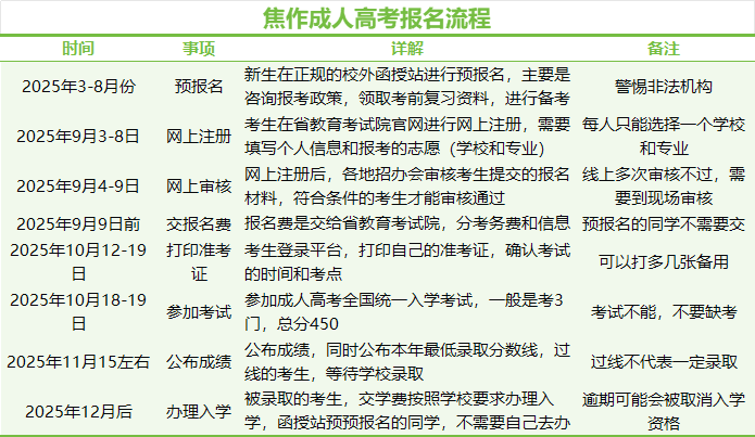 焦作市,河南省辖地级市,位于河南省西北部,北与山西省晋城市陵川县搭界,南与郑州市荥阳市、巩义市,洛阳市孟津区隔河相望,西与济源市毗邻,东与新乡市辉县市、获嘉县、原阳县接壤, [83]属暖温带大陆性季风气候,四季分明,总面积4071平方公里。焦作市地处中国南北交汇点、东西结合部,是郑州大都市区门户城市、中原城市群和豫晋交界地区的区域性中心城市、河南米字形高铁网重要节点城市、豫西北地区重要的物资集散地。在焦作市学历是非常重要的,而很多人提升学历都是选择成人高考的形式。成人高考全称是成人高等学校招生全国统一考试,是为中国各类成人高等学校选拔合格的毕业生以进入更高层次学历教育的入学考试,成人高考属国民教育系列,列入国家招生计划,国家承认学历,全国招生统一考试。成人高等学历教育分为专科起点本科(简称专升本)、高中起点本科(简称高起本)和专科(简称高起专)三种;在校学习形式分脱产、业余、函授三种(2025年秋季起,高等学历继续教育不再使用“函授”“业余”的名称,统一为“非脱产”)。成人高考每年九月份报名,十月下旬考试。
