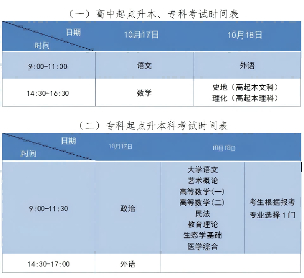 (1)高起本、高起专考试时间表