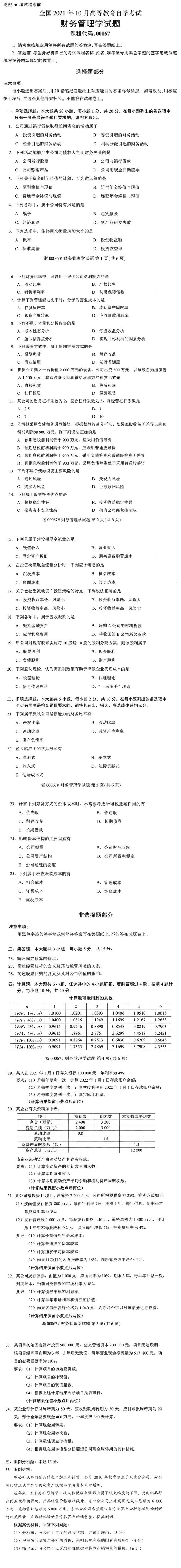 2025年10月自考真题:00067财务管理学